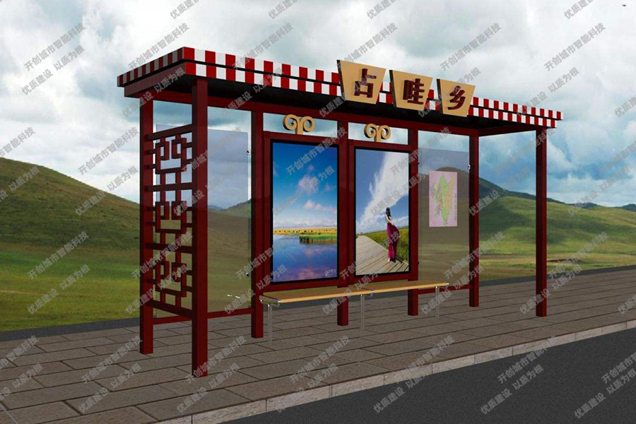 这款特色候车亭主体采用镀锌钢板结构,灯箱部分采用镀锌钢、不锈钢或铝型材材质,视窗面板采用钢化玻璃,灯箱内置LED灯、时控漏保、液压撑杆、颌及专用灯箱锁具,表面采用氟碳金属烤漆工艺。具有外形美观、表面耐腐蚀、抗风性能强、使用寿命长等优点。