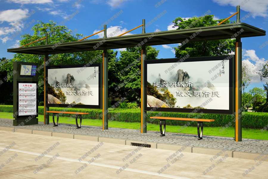 这款特色候车亭主体采用镀锌钢板结构,灯箱部分采用镀锌钢、不锈钢或铝型材材质,视窗面板采用钢化玻璃,灯箱内置LED灯、时控漏保、液压撑杆、颌及专用灯箱锁具,表面采用氟碳金属烤漆工艺。具有外形美观、表面耐腐蚀、抗风性能强、使用寿命长等优点。