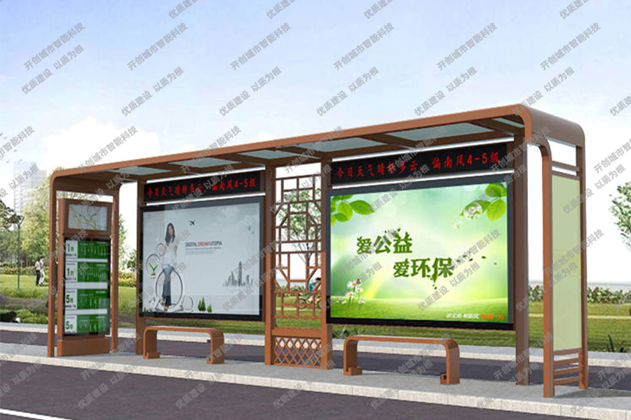 这款特色候车亭主体采用镀锌钢板结构,灯箱部分采用镀锌钢、不锈钢或铝型材材质,视窗面板采用钢化玻璃,灯箱内置LED灯、时控漏保、液压撑杆、颌及专用灯箱锁具,表面采用氟碳金属烤漆工艺。具有外形美观、表面耐腐蚀、抗风性能强、使用寿命长等优点。