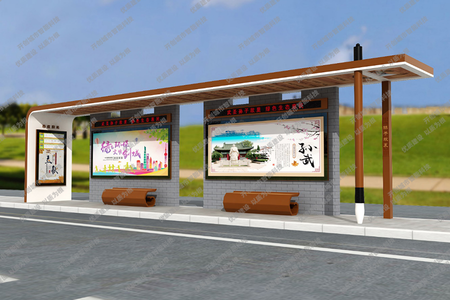 这款特色候车亭主体采用镀锌钢板结构,灯箱部分采用镀锌钢、不锈钢或铝型材材质,视窗面板采用钢化玻璃,灯箱内置LED灯、时控漏保、液压撑杆、颌及专用灯箱锁具,表面采用氟碳金属烤漆工艺。具有外形美观、表面耐腐蚀、抗风性能强、使用寿命长等优点。