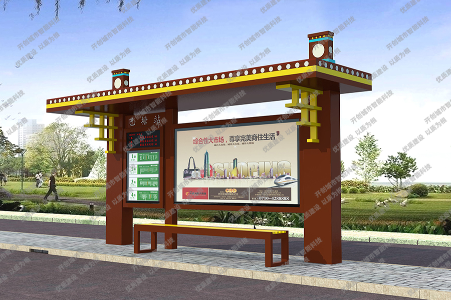 这款特色候车亭主体采用镀锌钢板结构,灯箱部分采用镀锌钢、不锈钢或铝型材材质,视窗面板采用钢化玻璃,灯箱内置LED灯、时控漏保、液压撑杆、颌及专用灯箱锁具,表面采用氟碳金属烤漆工艺。具有外形美观、表面耐腐蚀、抗风性能强、使用寿命长等优点。