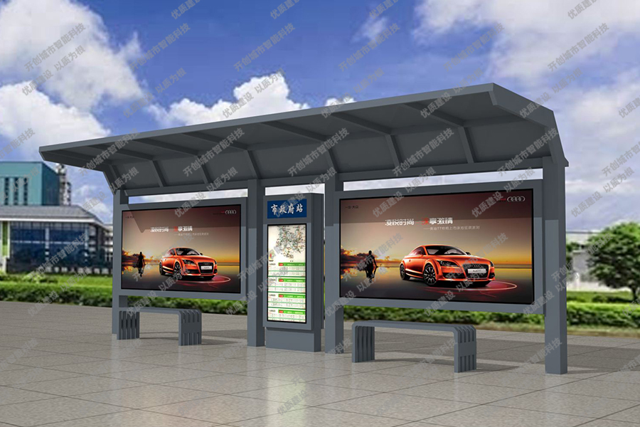 这款特色候车亭主体采用镀锌钢板结构,灯箱部分采用镀锌钢、不锈钢或铝型材材质,视窗面板采用钢化玻璃,灯箱内置LED灯、时控漏保、液压撑杆、颌及专用灯箱锁具,表面采用氟碳金属烤漆工艺。具有外形美观、表面耐腐蚀、抗风性能强、使用寿命长等优点。