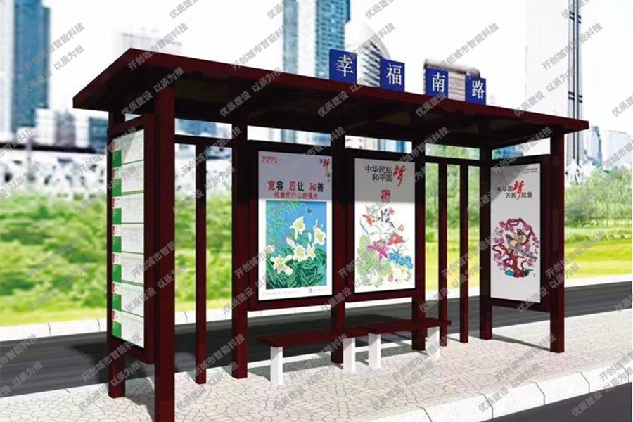 这款特色候车亭主体采用镀锌钢板结构,灯箱部分采用镀锌钢、不锈钢或铝型材材质,视窗面板采用钢化玻璃,灯箱内置LED灯、时控漏保、液压撑杆、颌及专用灯箱锁具,表面采用氟碳金属烤漆工艺。具有外形美观、表面耐腐蚀、抗风性能强、使用寿命长等优点。