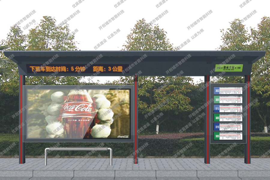 这款特色候车亭主体采用镀锌钢板结构,灯箱部分采用镀锌钢、不锈钢或铝型材材质,视窗面板采用钢化玻璃,灯箱内置LED灯、时控漏保、液压撑杆、颌及专用灯箱锁具,表面采用氟碳金属烤漆工艺。具有外形美观、表面耐腐蚀、抗风性能强、使用寿命长等优点。