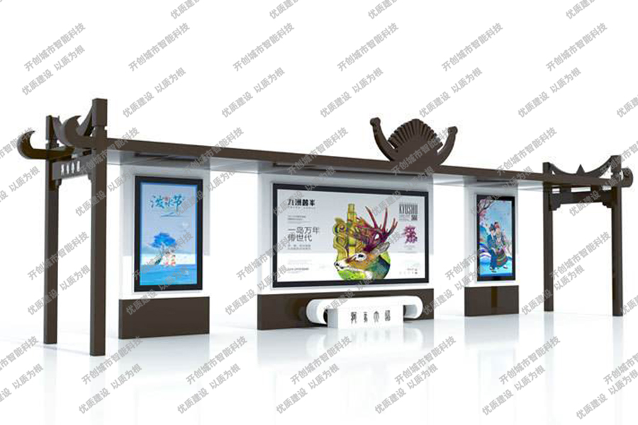 这款特色候车亭主体采用镀锌钢板结构,灯箱部分采用镀锌钢、不锈钢或铝型材材质,视窗面板采用钢化玻璃,灯箱内置LED灯、时控漏保、液压撑杆、颌及专用灯箱锁具,表面采用氟碳金属烤漆工艺。具有外形美观、表面耐腐蚀、抗风性能强、使用寿命长等优点。