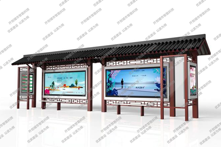 这款特色候车亭主体采用镀锌钢板结构,灯箱部分采用镀锌钢、不锈钢或铝型材材质,视窗面板采用钢化玻璃,灯箱内置LED灯、时控漏保、液压撑杆、颌及专用灯箱锁具,表面采用氟碳金属烤漆工艺。具有外形美观、表面耐腐蚀、抗风性能强、使用寿命长等优点。