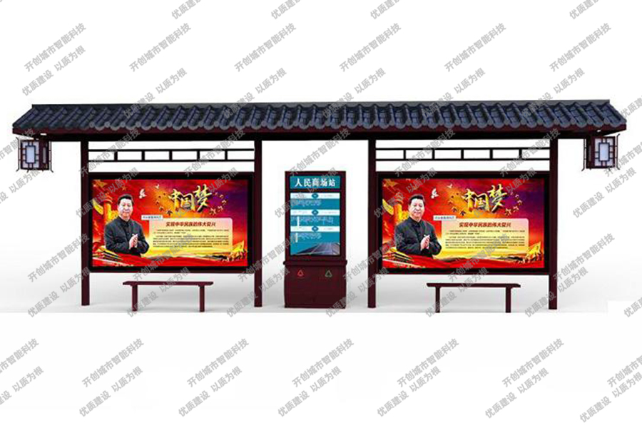 这款特色候车亭主体采用镀锌钢板结构,灯箱部分采用镀锌钢、不锈钢或铝型材材质,视窗面板采用钢化玻璃,灯箱内置LED灯、时控漏保、液压撑杆、颌及专用灯箱锁具,表面采用氟碳金属烤漆工艺。具有外形美观、表面耐腐蚀、抗风性能强、使用寿命长等优点。