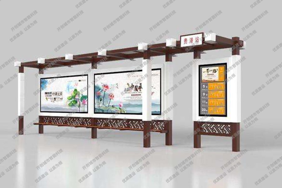 这款特色候车亭主体采用镀锌钢板结构,灯箱部分采用镀锌钢、不锈钢或铝型材材质,视窗面板采用钢化玻璃,灯箱内置LED灯、时控漏保、液压撑杆、颌及专用灯箱锁具,表面采用氟碳金属烤漆工艺。具有外形美观、表面耐腐蚀、抗风性能强、使用寿命长等优点。